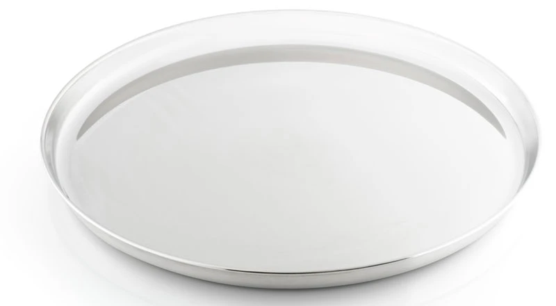 Ein großer Essteller aus poliertem Edelstahl mit hochgezogen Rand. Durch seine Größe bietet sich der Teller durchaus als Schneideunterlage an, auch eine große Scheibe Brot lässt sich problemlos schmieren.