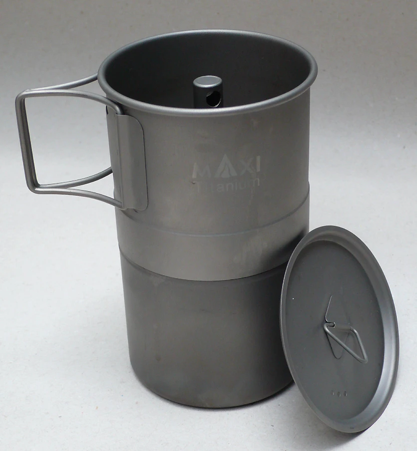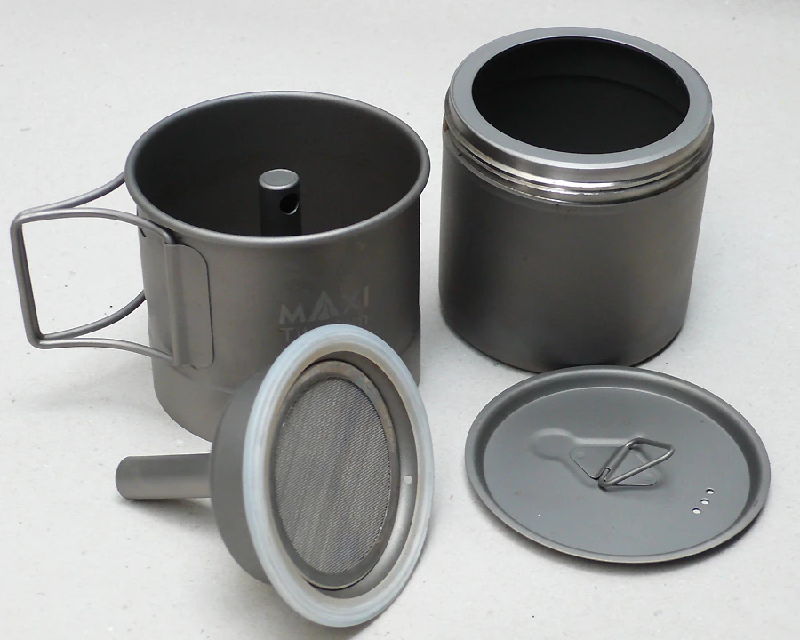 Diese geniale Kaffeemaschine für outdoors ist superleicht, da aus Titanium. Sie entspricht in der Bauart und Funktion den bekannten Kaffeemaschinen, mit denen in Südländern die diversen täglichen Kaffee-Infusionen bereitet werden.