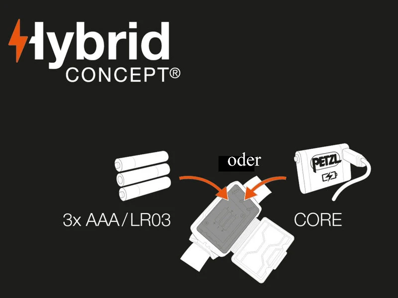 - Betriebsmöglichkeiten: 3 AAA/LR03-Batterien (1 Satz im Lieferumfang enthalten).Ni-MH-Akkus und Lithium-Batterien, der Core-Akku von Petzl sind möglich