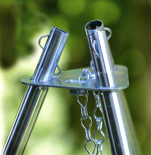 Dreibeine erlauben vielfältige Anwendungsmöglichkeiten. Gleichgültig, ob Sie den Gruppentopf oder einen Wassersack aufhängen wollen, den Grillrost übers Feuer bringen oder die Laterne in passender Höhe plazieren möchten. Stabil, sicher und klein für den Transport. Die 4-teiligen Stangen sind mit Gummikordel verbunden und dadurch schnell und sicher auf- und abgebaut. Eine vernickelte Kette mit zwei S-Haken sorgt für die Höhenverstellung. Verchromter Grillrost mit 43,2 cm Durchmesser. Gute Qualität für hohe Beanspruchung. Galvanisiertes Stahlgestänge komplett mit Kette und Grillrost.