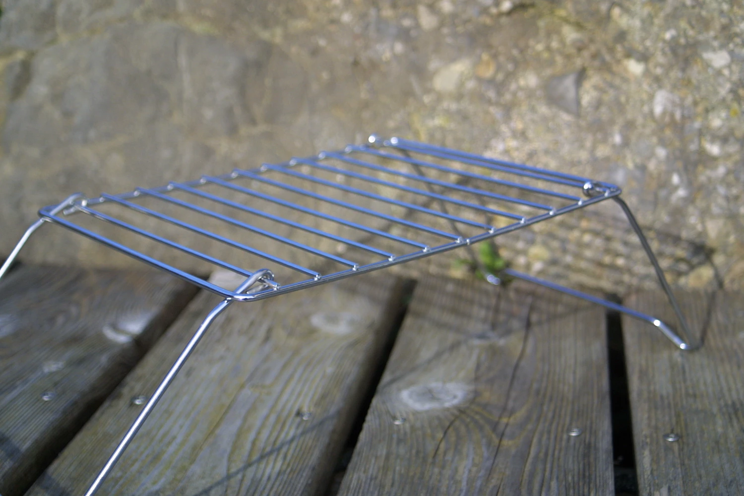 Ein kleiner, zusammenlegbarer Campinggrill, den man – ohne Gewissensbisse – ins Feuer schicken kann. Ohne scharfe Kanten und Ecken. Reicht aus für 2 große Steaks oder mehrere Würste. Sehr gute Verarbeitung, verchromt.