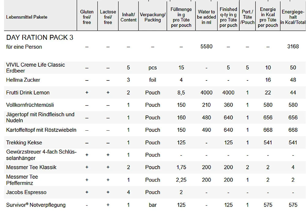 Das „Day Ration Pack“ ist ein individuell zusammengesetztes Verpflegungspaket für eine Person für 1 Tag. Die Basis der Pakete ist das Trek’n Eat Portfolio mit gefriergetrockneten Mahlzeiten – sehen Sie die einzelnen Mahlzeiten auch dort. Durch Gefriertrocknung wird den Nahrungsmitteln von Trek’n Eat der Wasseranteil vollständig entzogen, ohne dabei wichtige Vitamine